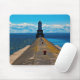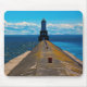 A long breakwater stretches across the water toward a distant lighthouse, drawing the eye along its weathered surface. The contrast between textured concrete, open water, and sky creates a strong sense of direction and depth.