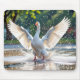 A white goose splashes energetically in a splash pad as it spreads its wings wide, with sunlit droplets creating a sparkling effect around it