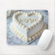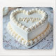 A heart-shaped cake with the word "ENGAGED" written on top is elegantly decorated with swirls of white frosting