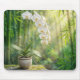 Potted orchid plants with white blossoms are illuminated by sunlight filtering through a bamboo forest