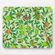 Mouse pad em um padrão de limões, romãs e pêssegos, com flores, de arte William Morris Art Nouveau, com flores, em ramos de folhas - fruta em verde limão e laranja de coral, com folhas verdes, contra fundo de padrão, verde limão e branco