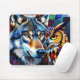 A vibrant colorful ai illustration of a wolf and an owl in a mosaic stained glass effect. A nice mouse pad for those who love wildlife.
