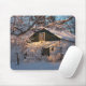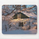 O nascer do sol da manhã cedo brilha sobre uma nova cobertura de neve que cobre os campos e o celeiro.