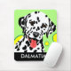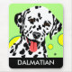 Arte colorida de cachorro apresentando Dálmata branco com manchas pretas contra um fundo verde claro e círculos amarelos