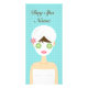 A bela ilustração de desenho animado de Destei de uma mulher morena vestindo uma toalha em sua cabeça e corpo e tendo uma máscara branca em seu rosto junto com pepinos em seus olhos e uma flor rosa perto de seu ouvido. A cor de fundo é azul claro e macio com um padrão de bolinhas fofo. No outro lado da placa há áreas de texto personalizáveis para opções de serviço. Esse produto é perfeito para termas, resort termal, salão de beleza, cosmetólogo ou para massagista, por exemplo.