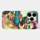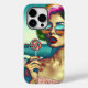 Mulher de estilo retrô de óculos de sol com cabelo colorido e um pirulito com fundo de praia em cores psicodélicas.
