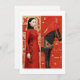 Mulher com um vestido floral vermelho florado com um cavalo preto. Arte genérica inspirada no design do folk da Europa Oriental.