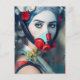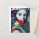 Mulher em máscara de gás e cartão postal de flores
