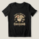 Emblema retrô com uma galinha central com vacas, cabras, porcos, ícones de celeiro, e a citação engraçada "Sim, Falo com Galinhas" em fundo transparente para camisetas.
