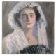 Esta design apresenta uma pintura do artista japonês Fujishima Takeji (1867-1943), que é notado por seu trabalho dentro de uma tradição de impressionismo ao estilo ocidental. Mostra uma senhora vestindo uma roupa branca elegante com um véu. Ela está segurando um fã preto em sua mão. A mulher está encarando a pintura com inteligência e confiança. É uma bela evocação da feminilidade. A arte original foi produzida em 1909.