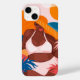Mulher afro-americana curvy, na Feira de Praia cercada pela cena da praia de abstrato e pelas folhas tropicais.