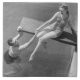 Mulher que senta-se no conselho de mergulho, homem que agarra sua mão (B&W), marcas elevados da vista | George | AssetID: 72131088