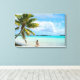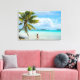 impressão de paisagem canvas de uma mulher em biquíni sob uma palmeira pendurada na água superficial da lagoa na praia de uma ilha tropical no arquipélago pacífico da Polinésia Francesa.
