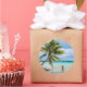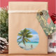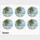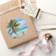 Um adesivo fotográfico redondo de uma mulher em biquínis sob uma palmeira pendurada na água superficial da lagoa na praia de uma ilha tropical no arquipélago pacífico da Polinésia Francesa.