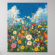 Esta pintura vibrante retrata um campo de flores silvestres sob um céu azul brilhante. Apresentando margaridas, papoilas e outros florins em tons de laranja, rosa, vermelho, azul e branco, o trabalho de arte capta uma cena exuberante e viva. O céu limpo com nuvens brancas lisas adiciona profundidade, enquanto o estilo impressionista com pinceladas ousadas e cores vívidas evoca um dia alegre e ensolarado. Perfeito para iluminar qualquer quarto com um toque da natureza.