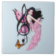 Uma fada bonita toda rosa com uma nota musical e borboleta num pano de fundo azul