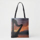 Tote Bag com o pôr do sol sobre o mar de Bering e a silhueta de uma harpa com as palavras de Lao Tzu, Música da alma, podem ser ouvidas pelo Universo.