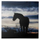 Um belo mustang diante da tempestade que se aproxima com azuis e cinzentos incríveis no céu. Um bonito azulejo de arte.