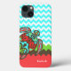 capas de iphone de na moda, feita em aquamarina de tendência e padrão ziguezague branco de chevron, com faixas verdes, marrons e coloridas de coral, na parte inferior. Gráficos de uma tartaruga marinha inspirada em marrom, aquamarina, verde e laranja coral, decoram o lado esquerdo. Personalize o texto branco para atender às suas necessidades. Excelente maneira de personalizar seu telefone com uma aparência divertida que todos lhe perguntarão. Escolha o estilo do iPhone que você quer que este design seja ligado.