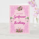 Um cartão de aniversário bonito para um namorada. Uma traria elegante em conjuntos cor-de-rosa das quatro rosas cor-de-rosa. O fundo é um padrão rosa pálido de flores. Uma carta adorável para enviar a uma namorada no seu aniversário.