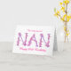 Cartão de texto bonito Nan com aquarela, as palavras Nan pintado em roxo e torcido com flores de orquídea cor-de-rosa doce. Este cartão de branco pode ser personalizado com a idade de aniversário da sua própria mãe e a escolha de dentro, este design também está disponível em outros produtos. © Original watercolor art e design por Sarah Trett. www.sarahtrett.com para www.mylittleeden.com