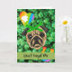 Não se esqueça do seu Cachorro, Rua. Cartão do Dia de Patrick com uma ilustração de um Pug em um fundo de shamrock, um coração, arco e uma ferradura de sorte. Obrigados para Pixabay e Creative Fabrica para alguns dos elementos do design.
