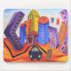 Uma pintura colorida, divertida e imaginativa representando alguém em um carro deixando uma cidade com prédios tortos.