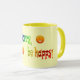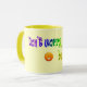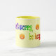 Texto multicolorido e faces amarelas sobre fundo amarelo pálido.