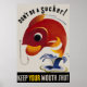 Vintage, 1944, Frente Inicial da Segunda Guerra Mundial dos EUA, intitulada "Não seja um Sucker - Mantenha sua boca fechada!" Por um artista desconhecido, mostra um salto de peixe cartoon a saltar à toa com a boca aberta, pronto para levar um gancho de peixe na boca.
