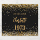 Um fundo preto decorado com confete de ouro. O texto: O nome é escrito em ouro rosa escuro com um grande estilo escrito à mão moderno. Personalize e adicione uma data, nome e ano de nascimento.