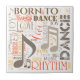 Dançar é sua paixão? Este legal azulejo cerâmico com uma palavra design de nuvem diz tudo. Algumas das palavras, intercaladas com notas musicais, são: respirar, ao vivo, amor, dança, ritmo e nascer para dançar. Esta versão apresenta tons quentes de marrom, ouro e laranja na cor de fundo de sua escolha. Procure ID277 para ver opções de cores adicionais e produtos correspondentes a este design.