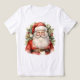 T-shirt com uma imagem de aquarela de estilo de vintage fofo. Papai Noel de terno vermelho com bochechas alegres e um rosto sorridente. Cercado por pinheiro e sagrado.
