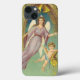 Ilustração antiga religiosa de Natal vitoriano com uma imagem de um anjo músico com asas flutuando e segurando uma corneta musical. Um querubim angelical flutua ao lado dela segurando uma cornucópia (um símbolo clássico de abundância e nutrição) com moedas de ouro derramando. Sininhos de ouro estão soando com música.