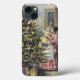 Ilustração antiga de Natal Feliz vitoriano com uma família com pais e irmãos em pé ao redor de uma árvore decorada com brinquedos e enfeites. A mãe está segurando uma criança, uma menina feliz. As outras crianças estão atrás deles e o pai está entrando pela porta. Saudações da temporada!
