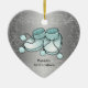As botas feitas malha azul do bebé em um coração deram forma ao ornamento com texto customizável e a um fundo feito em um tom prateado com faísca do falso - brilho que cerca as botas do bebê. É mostrado para Natal dos bebês o ø mas você pode personalizar para toda a necessidade que você puder ter como o chá de fraldas ou Reversible um presente do bebê ou de um primeiro aniversario etc. dos bebês - frente e verso com a toda a informação do nascimento do bebé na parte traseira. Faz um presente recém-nascido maravilhoso da lembrança.