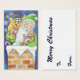 Ilustração vintage de design de feriado de Natal feliz com um Papai Noel fofo e alegre no telhado de uma casa. Ele está carregando um saco de brinquedos, bastões de doces e um ursinho de pelúcia descendo por uma chaminé coberta de neve à noite com estrelas no céu na véspera de Natal. Ho, ho, ho, Felicidades e Boas Festas!