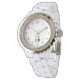 Aqui vocês podem admirar um dos desenhos de Natal, eu chamo, "FrankenCheese de Natal", FrankenCheese vestido de Papai noel, com uma árvore de Natal decorada, o texto diz, "Feliz Natal". Agora você pode pedir, "Natal FrankenCheese", neste relógio de esmalte branco de rocha feminino para desejar a alguém um Feliz Natal."