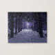 Uma árvore de Natal cintilante numa floresta de pinheiros coberta de neve na noite de inverno.
