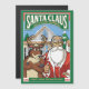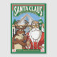 Esta design de Natal parece um velho playbill ou poster de filme que diz "Papai Noel e a Reindeer Kicking". Esta design de Natal retrógrada tem um fundo com uma igreja, uma árvore de Natal com neve, e flocos de neve caindo.