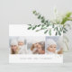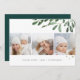 Mande cartões de natal para amigos e família em estilo chic com nossos cartões com fotos elegantes. Projetado para acomodar três de suas fotos quadradas favoritas, dispostas lado a lado em um formato de colagem, o cartão apresenta sua saudação personalizada (mostrada com "Alegria de Natal") e o(s) nome(s) da família centrados no fundo, com imagens graciosas de uma mistura de cores d'água pintada verde profunda no topo.