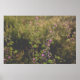 A photograph of nature and purple flowers in golden afternoon light at an open meadow at springtime