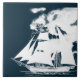 Navio alto navegando tranquilamente e uma nuvem fluffy pairante como companhia...dia perfeito. Toda uma silhueta branca sobre um elegante fundo azul escuro, personalize para seu gosto.