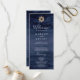 Este programa moderno de náutica de náutica de náutica é perfeito para um casamento de cruzeiro ou praia. O simples design apresenta uma roda de barco dourada sobre um fundo de marinho azul-d'água. Inclua o nome da noiva e do noivo, a data e o local do casamento, a mensagem do obrigado, a ordem do serviço, a festa noiva e um memorial "em memória amorosa" opcional.