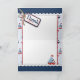 Cores náuticas em vermelho, branco clássicos, e azul com âncora e caranguejos e um obrigado que da novidade você etiqueta com a guita.