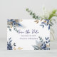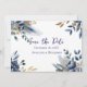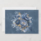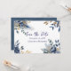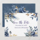 A watercolor floral corner design with deep navy blue peonies and roses arranged in a decorative corner pattern. The flowers have detailed petals with subtle shading and golden-brown centers. Small sprigs of delicate baby's breath with tiny gold-colored buds are scattered throughout. The foliage consists of sage green leaves in various shades, with larger leaves positioned behind the blooms and smaller leaves trailing along the stems. The design is set against a pure white background, creating a clean, elegant contrast with the dark blue flowers. The composition is symmetrical, with the flowers and leaves arranged in a corner format that could be used as a border or frame. The watercolor technique gives the flowers a soft, ethereal quality with subtle color variations and natural imperfections characteristic of hand-painted artwork.