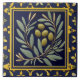 green olive farm ceramic tile,mediterranean green yellow fruit,traditional portuguese spanish nature,,italian farmhouse home,decorative folk rustic farming villa,dark navy blue vintage art, "matte golden gold border", "botanical leafy leaves", "arty border perimeter frame", "classic amalfi italy olives branch"