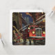 Ilustração vintage de ocupação comercial apresentando pessoal de emergência, bombeiros trabalhando para apagar um incêndio violento em um prédio em chamas na escuridão da noite em uma cidade urbana sob uma ponte imponente. Os bravos homens e mulheres bombeiros estão segurando mangueiras com água de seus caminhões de bombeiros.