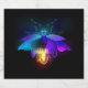 Voz mecânica, antiga, com lâmpada e asas finas brilha cor de laranja, roxo, turquesa sobre fundo preto. Estilo Steampunk.