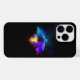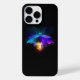 Voz mecânica, antiga, com lâmpada e asas finas brilha cor de laranja, roxo, turquesa sobre fundo preto. Estilo Steampunk.