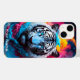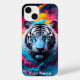 A imagem mostra um tigre majestoso com aparência mística e etérea. O tigre é representado principalmente em tons de azul, com padrões intrincados e elementos brilhantes enfeitando seu pelo, particularmente ao redor de seu rosto e corpo. O fundo apresenta um design simétrico e ornamentado com motivos celestes, incluindo luas em crescente, estrelas e padrões giratórios. O efeito geral é de beleza de outro mundo, misturando elementos da natureza e fantasia sem falhas. O olhar intenso do tigre e a postura regal contribuem para o sentido de poder e mistério emanando da trabalho de arte.